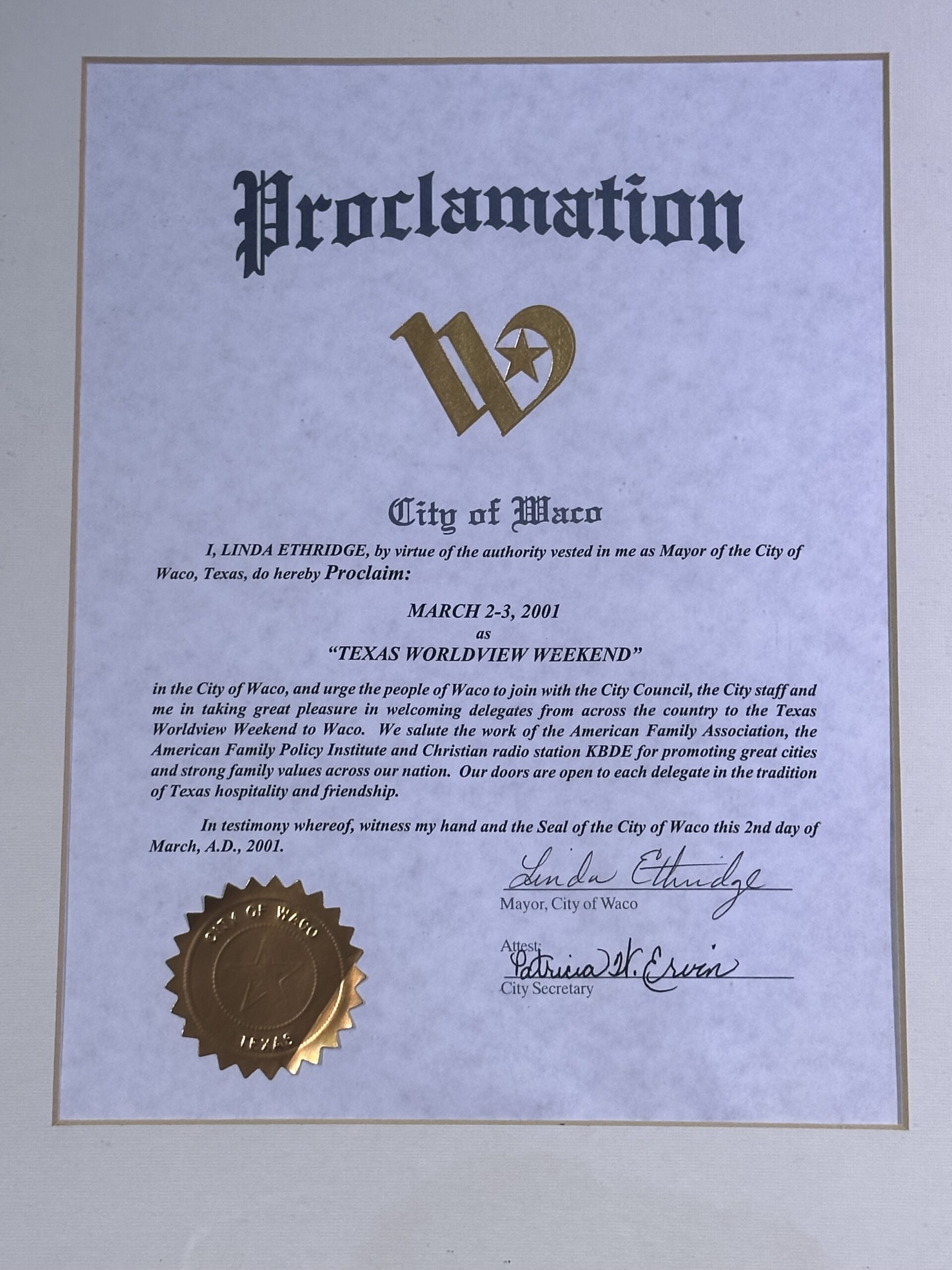 Mary of Waco, Texas declared “Texas Worldview Weekend” for the Brannon Howse Worldview Weekend, March 2-3, 2001.